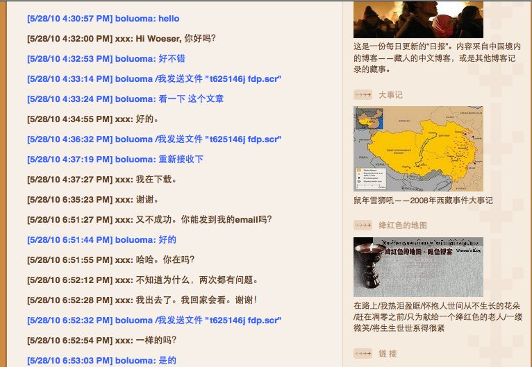 In her blogpost, Woeser writes that she was out all day and not online on May 28, 2010. However, her Skype ID was contacting her friends. Below is a translation of a Skype chat between a hacker impersonating Woeser using her Skype ID "boluoma" and trying to send one of her contacts an infected file: